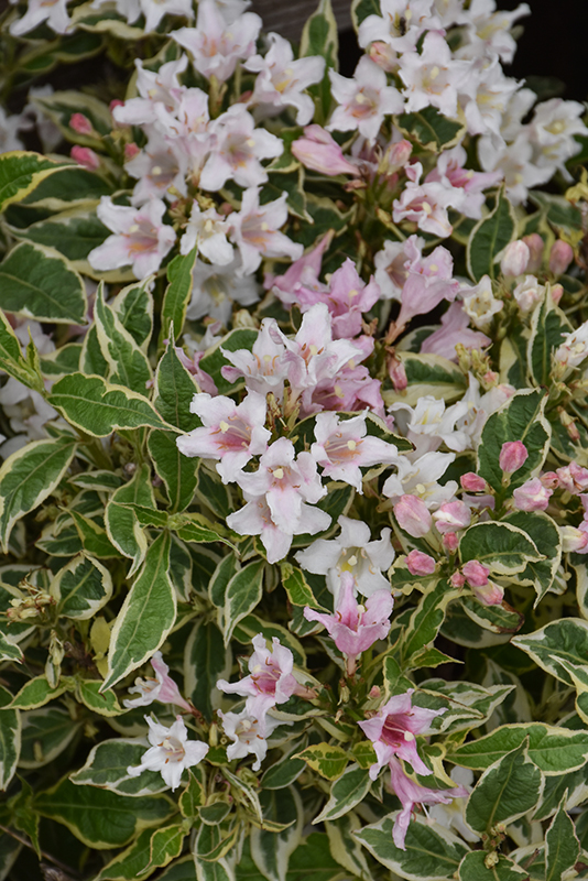 Mor-Colorful Weigela features showy clusters of pink trumpet-shaped flowers along the branches in late spring, which emerge from distinctive rose flower buds. It has attractive creamy white-variegated green foliage with hints of pink which emerges lime green in spring. The pointy leaves are highly ornamental but do not develop any appreciable fall colour.