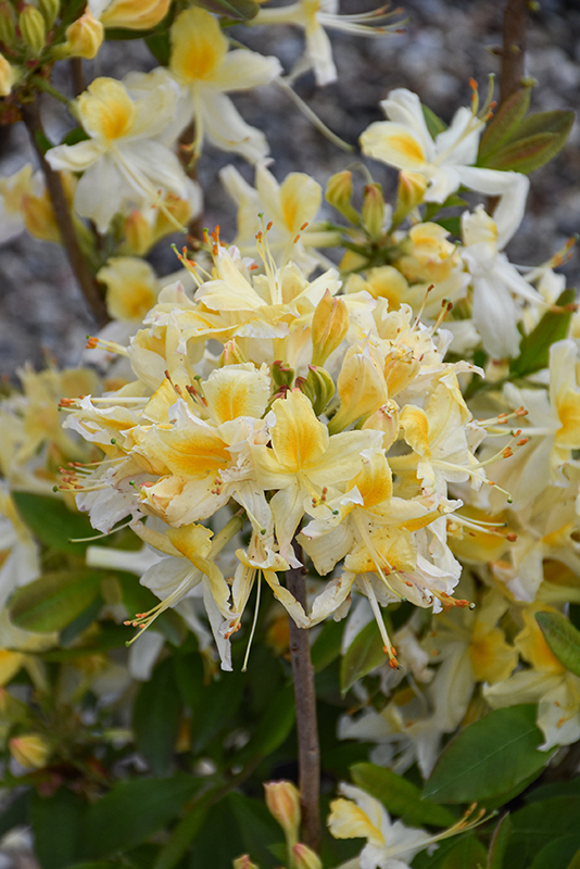 A hardy deciduous azalea, featuring creamy white flowers with elegant yellow accents in spring before the leaves, tall upright habit and good fall color; absolutely must have well-drained, highly acidic and organic soil, plant with plenty of peat moss