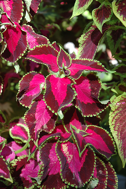 Chocolate Covered Cherry Coleus' attractive serrated pointy leaves remain cherry red in colour with distinctive light green edges and tinges of crimson throughout the year on a plant with an upright spreading habit of growth.