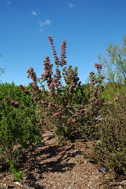A vigorous spring-flowering shrub that's covered in pink trumpet-shaped flowers, attracts hummingbirds; a background shrub the rest of the year, bushy, coarse and open in habit, good for general garden use; needs full sun, probably the hardiest variety