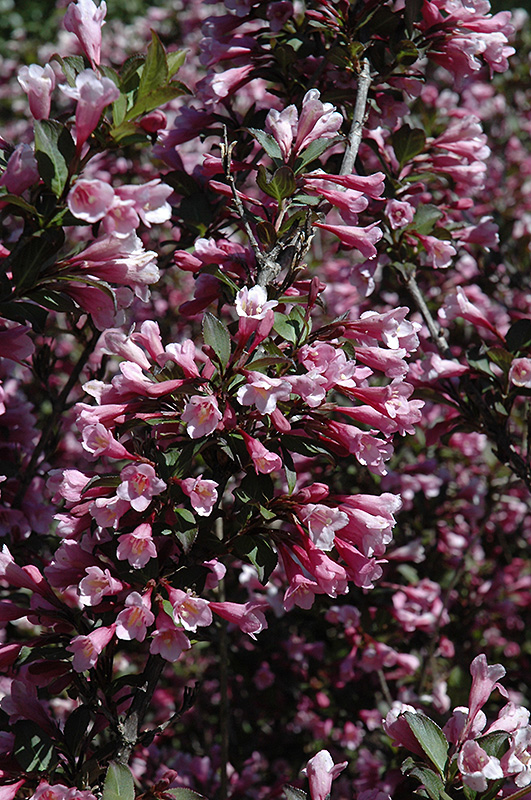 Java Red Weigela features showy clusters of rose trumpet-shaped flowers along the branches in late spring. It has attractive purple-tipped dark green foliage which emerges deep purple in spring. The pointy leaves are highly ornamental but do not develop any appreciable fall colour.