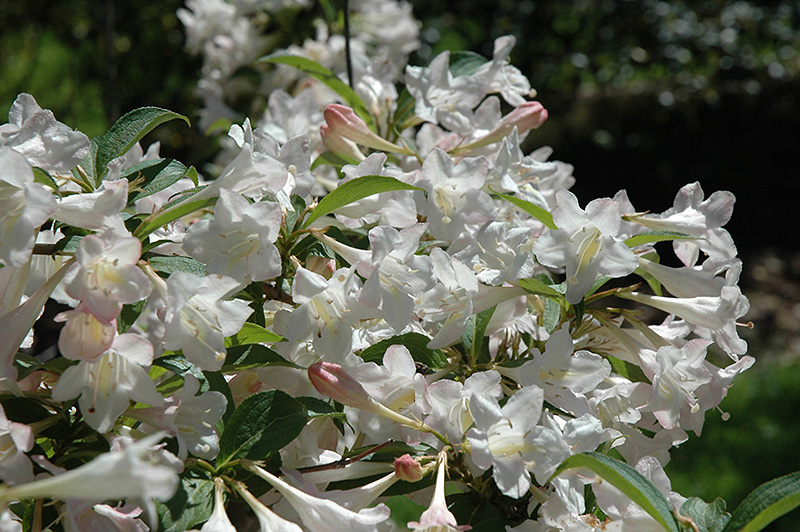 White Knight Weigela is bathed in stunning clusters of white trumpet-shaped flowers along the branches in late spring. It has forest green deciduous foliage. The pointy leaves do not develop any appreciable fall colour.