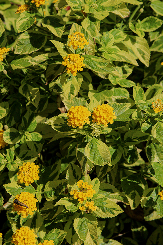 Samantha Lantana features showy cymes of yellow flowers at the ends of the branches from early summer to mid fall. Its attractive tomentose pointy leaves remain dark green in colour with showy creamy white variegation throughout the year.