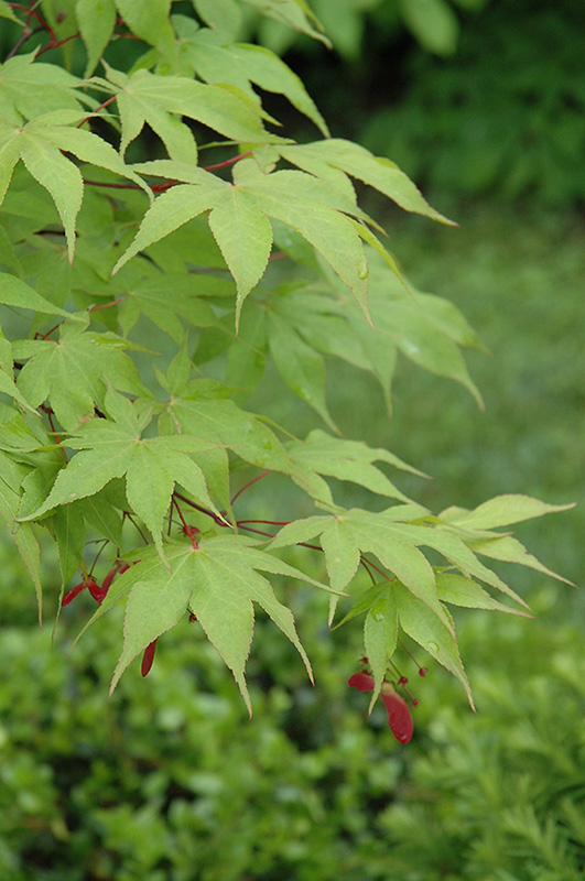 Osakazuki Japanese Maple is primarily valued in the landscape for its ornamental globe-shaped form. It features subtle corymbs of red flowers rising above the foliage in mid spring before the leaves. It has light green deciduous foliage. The lobed palmate leaves turn outstanding shades of yellow, orange and scarlet in the fall. The rough gray bark and red branches add an interesting dimension to the landscape.