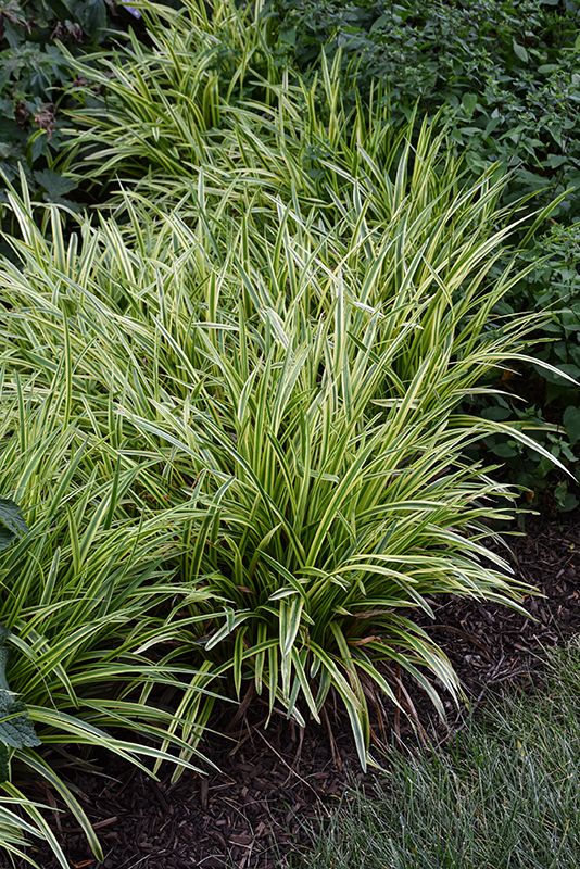 A tufted grass like variety that features a clump of arching, glossy, bright green leaves with yellow edges; a beautiful display of lovely lavender pink flower spikes; it is best as an edging plant or massed as a groundcover; less variegation in shade