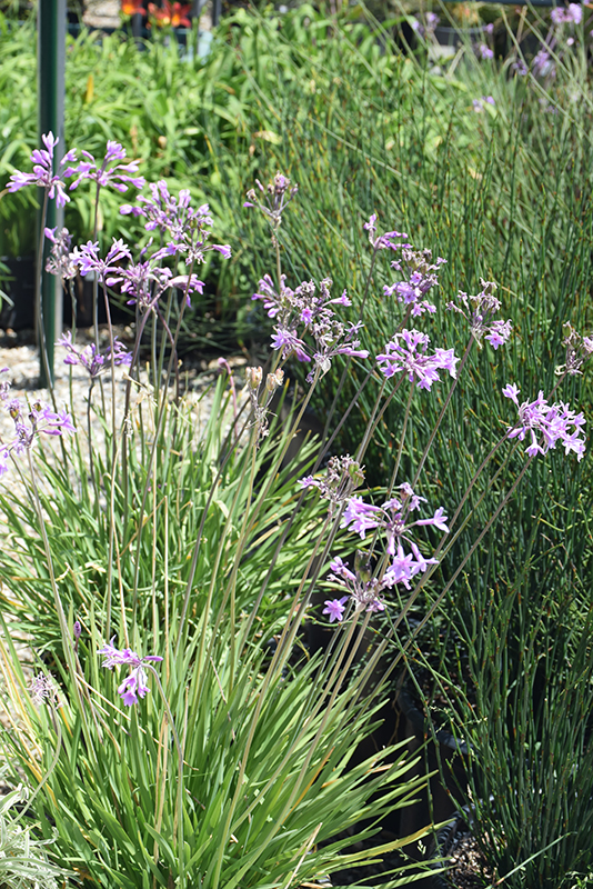 A fast growing, clumping plant with narrow, strap like leaves that smell strongly of garlic when bruised; lovely lilac colored flowers in mid summer persist into fall; ideal for an herb garden, or containers