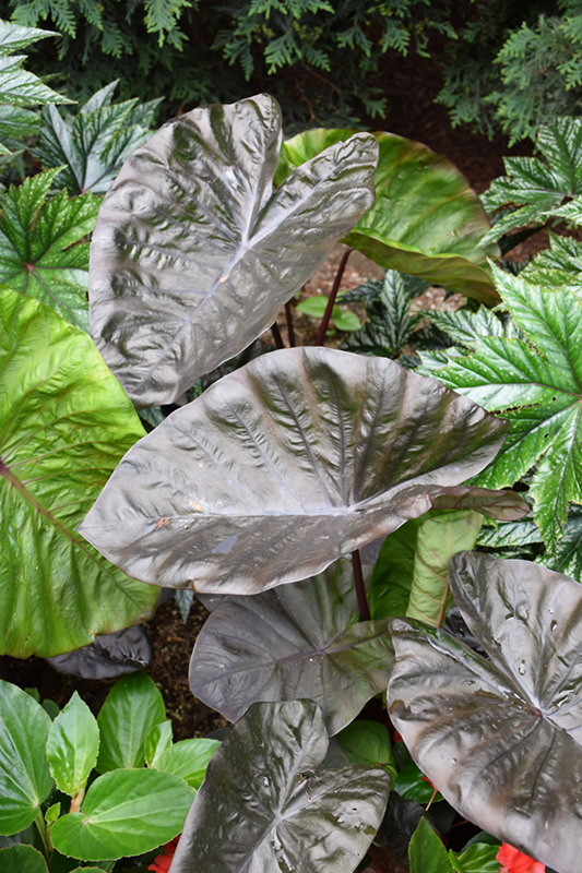 Royal Hawaiian® Black Coral Elephant Ear is primarily valued in the landscape or garden for its cascading habit of growth. Its attractive enormous heart-shaped leaves remain burgundy in colour with showy black variegation and tinges of dark red throughout the season.