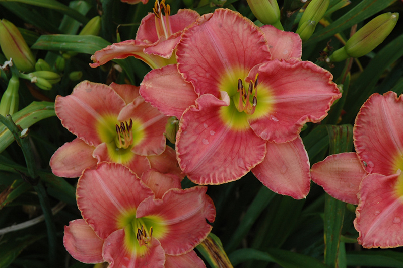 Scottish Fantasy Daylily features bold coral-pink trumpet-shaped flowers with pink overtones, lime green throats and a yellow ring at the ends of the stems in mid summer. The flowers are excellent for cutting. Its grassy leaves remain green in colour throughout the season.