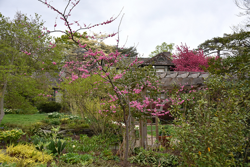 A lavish small ornamental tree featuring vivid pink flowers from bright red buds in early spring, followed by red-tinged leaves that turn green; adaptable to a variety of soil conditions; older dark brown bark exfoliates to reveal orangish inner bark