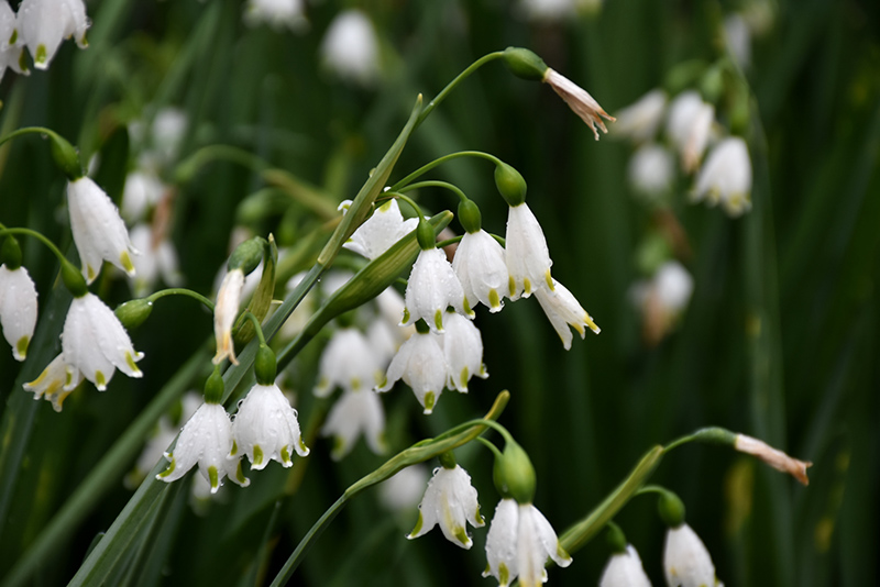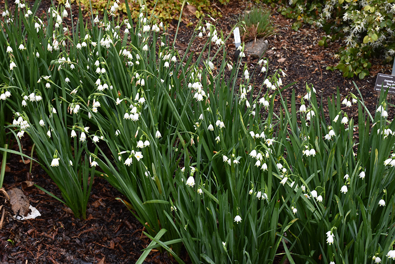 Gravetye Giant Summer Snowflake will grow to be about 18 inches tall at maturity extending to 28 inches tall with the flowers, with a spread of 18 inches. When grown in masses or used as a bedding plant, individual plants should be spaced approximately 14 inches apart. Its foliage tends to remain dense right to the ground, not requiring facer plants in front. It grows at a fast rate, and under ideal conditions can be expected to live for approximately 10 years. As an herbaceous perennial, this plant will usually die back to the crown each winter, and will regrow from the base each spring. Be careful not to disturb the crown in late winter when it may not be readily seen! As this plant tends to go dormant in summer, it is best interplanted with late-season bloomers to hide the dying foliage.