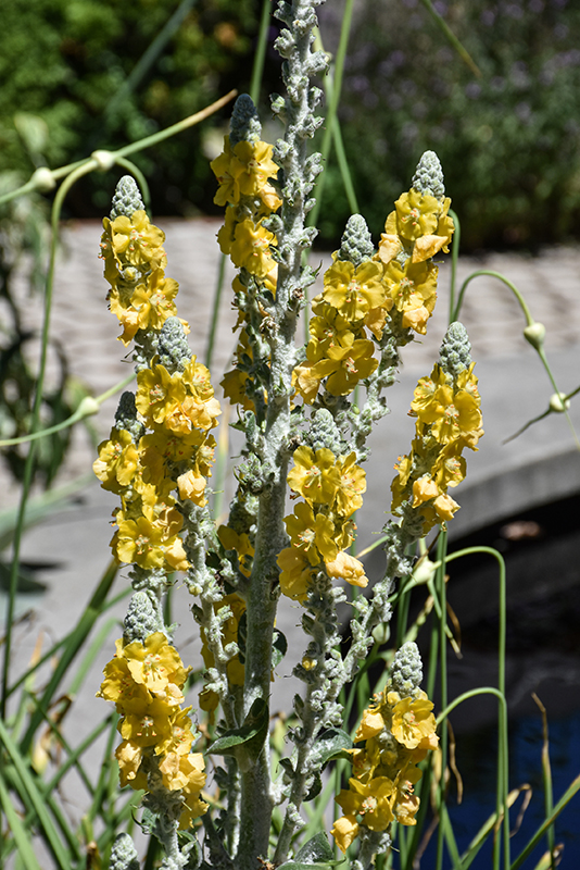A biennial that produces large, basal rosettes of foliage that are silvery gray; tall, fuzzy, silver-white spikes with lumious yellow flowers rise up in summer; a spectacular border accent