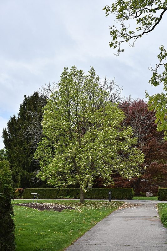 A hybrid magnolia which is bathed in large creamy yellow flowers in spring; upright habit of growth with a central leader and large, coarse leaves; an excellent specimen tree, best located where its flowers can be appreciated close-up