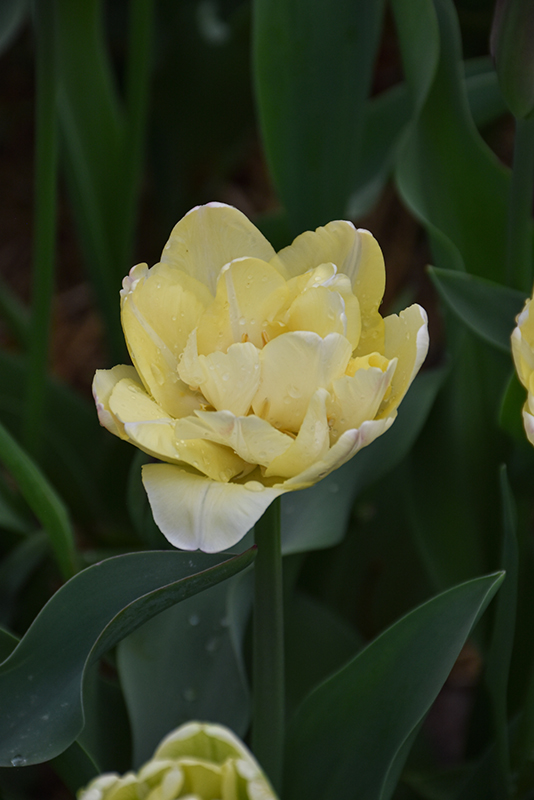 Creme Upstar Tulip has masses of beautiful double buttery yellow cup-shaped flowers with white overtones, gold eyes and rose edges at the ends of the stems from mid to late spring, which are most effective when planted in groupings. The flowers are excellent for cutting. Its sword-like leaves remain green in colour throughout the season.