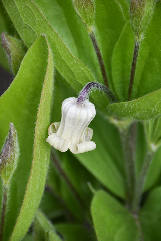 Freemont's Leather Flower features dainty lightly-scented nodding purple bell-shaped flowers with white overtones at the ends of the stems from mid to late spring. The flowers are excellent for cutting. Its tomentose pointy compound leaves emerge chartreuse in spring, turning dark green in colour throughout the season.