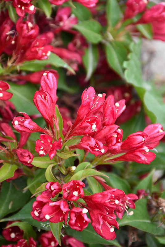 Crimson Kisses Weigela is clothed in stunning clusters of crimson trumpet-shaped flowers with white throats along the branches from late spring to mid summer. It has forest green deciduous foliage. The pointy leaves do not develop any appreciable fall colour.