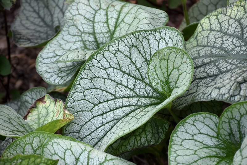 Large, attractive heart shaped leaves are silver with green veins; pretty blue flowers in spring; makes a nice accent in containers and lightens up shade gardens; avoid hot afternoon sun