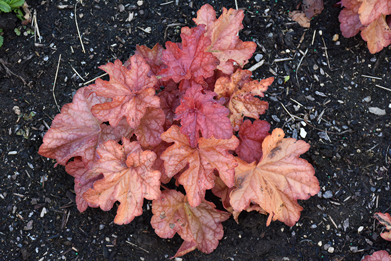 Heavily ruffled foliage develops stunning hues of orange, peach, coral and pale yellow; spikes of ivory bells in late spring to early summer; amazing contrast to other plants; great versatility; keep soil moist in heat of summer