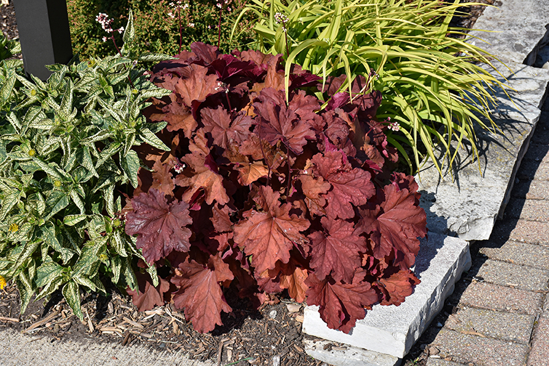 Rio Coral Bells features dainty spikes of white bell-shaped flowers rising above the foliage from late spring to mid fall. Its attractive crinkled lobed leaves emerge peach in spring, turning coppery-bronze in colour with showy coral-pink variegation and tinges of buttery yellow the rest of the year.