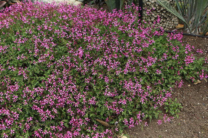 This selection is a spreading, branched, aromatic variety with ferny, celery scented foliage; stunning, magenta orchid-like flowers emerge in late winter and continue throughout the growing season; excellent for hanging baskets