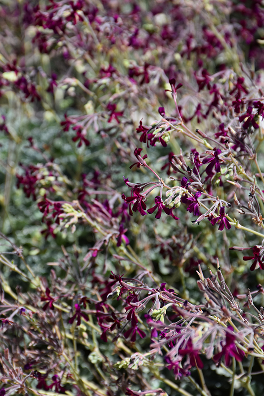 Long stalked, heart shaped velvety leaves are mildly aromatic; dainty clusters of deep red, nearly black flowers dot the plant all season; perfect for patio containers