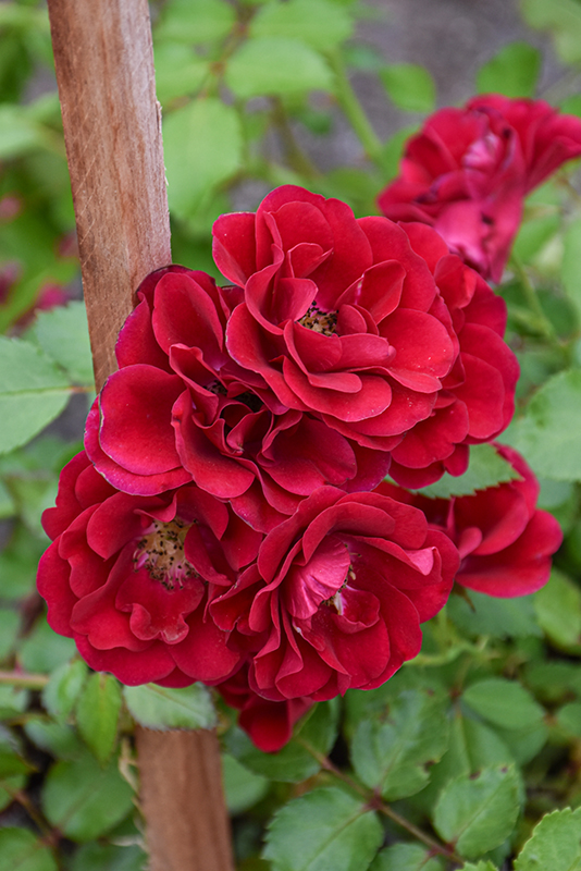 Fire Meidiland® Rose features showy double red flowers with gold eyes at the ends of the branches from late spring to early fall. The flowers are excellent for cutting. It has green deciduous foliage which emerges crimson in spring. The glossy oval compound leaves do not develop any appreciable fall colour.