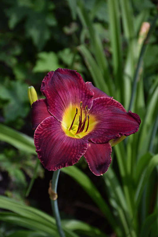 Fragrant, deep reddish-purple trumpets with yellow-green throats and cream picotee edges; great grassy texture and form; tetraploid; blooms appear in mid-summer; this striking addition to the garden or border is a healthy, vigorous grower