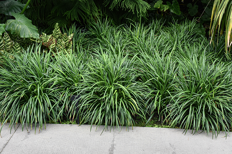 A tufted grass like perennial that features a clump of arching, glossy, dark green leaves; features a beautiful display of lovely purple-lilac flower spikes; best used as an edging plant or massed as a groundcover