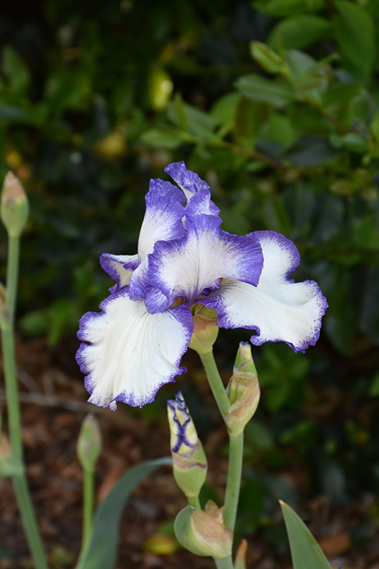 This vibrant iris produces ruffled white blooms with thick, deep blue-violet plicata edges giving sharp color contrast; a stunning addition to the perennial border; also excellent massed in groupings in the garden; extraordinary, multiple bloom habit