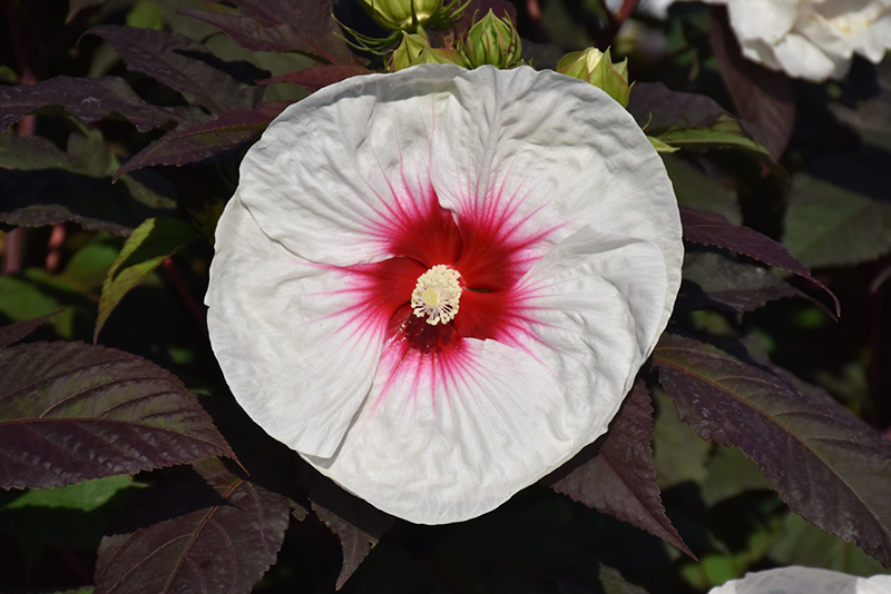 Showy, huge, lightly ruffled white flowers with deep scarlet eyes really make a bold statement opening above attractive dark bronze-green leaves; flowers are produced from the top to the bottom of the plant; do not allow to dry to wilting point