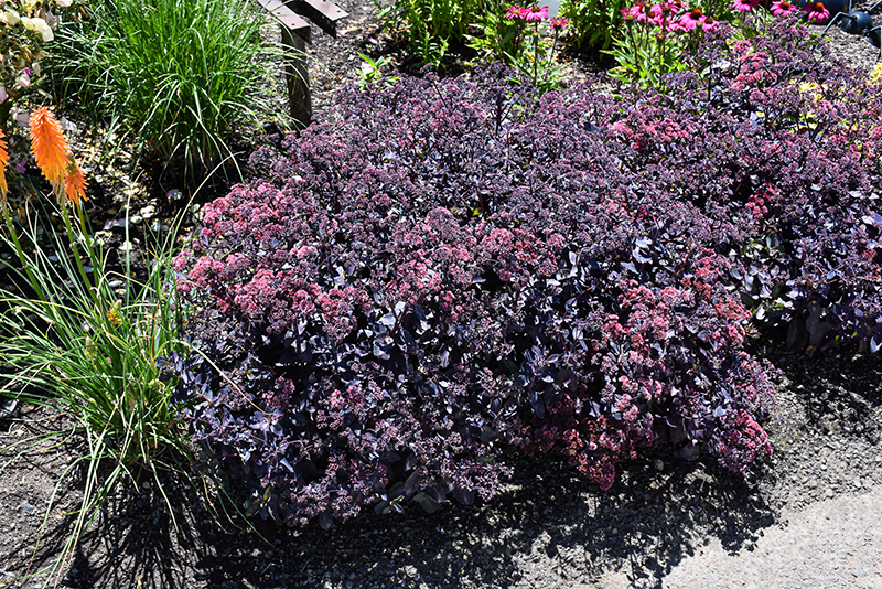A compact upright stonecrop with large clusters of deep pink flowers held atop distinct, deep dark purple succulent foliage; a drought-tolerant perennial that does best in poor soils; a colorful groundcover or feature in containers or rock gardens