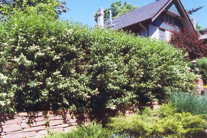 A large shrub commonly used in trimmed hedges, takes pruning exceptionally well; densely branched, interesting flowers (if not pruned) followed by black berries in fall; easy to grow, handles polluted city conditions well