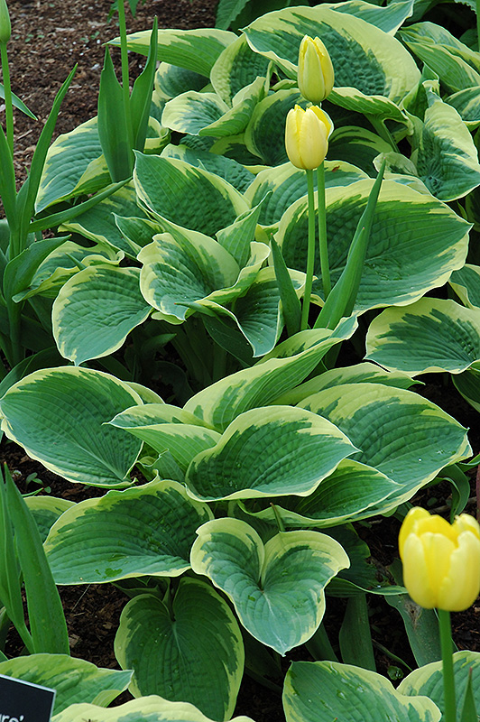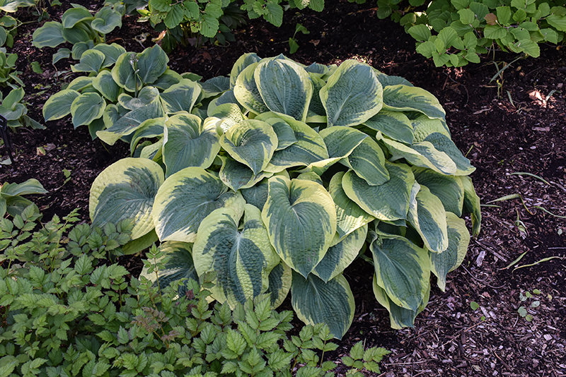 A wonderful slug resistant and easy to grow variety producing large mounds of lightly textured, blue-green foliage with creamy white edges; white flowers appear on tall scapes in the midsummer; great for adding color and texture to beds and borders
