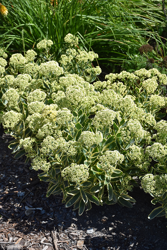 Frosted Fire Stonecrop has masses of beautiful clusters of rose flowers at the ends of the stems from late summer to late fall, which emerge from distinctive white flower buds, and which are most effective when planted in groupings. The flowers are excellent for cutting. Its attractive large succulent oval leaves remain green in colour with distinctive buttery yellow edges throughout the season.