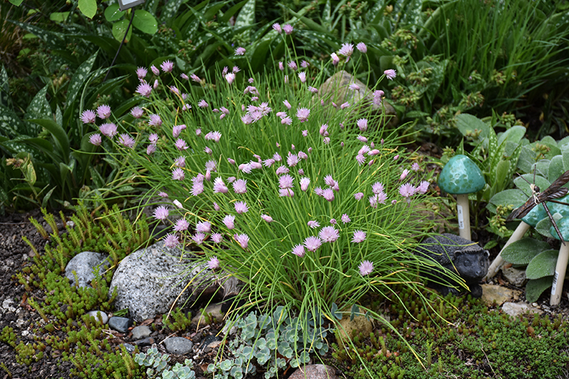 This is a compact variety of common chives with a shorter height that works better for containers; fine, gray-green foliage is topped with lavender-pink flowers in late spring; flowers and leaves are edible; also great along borders