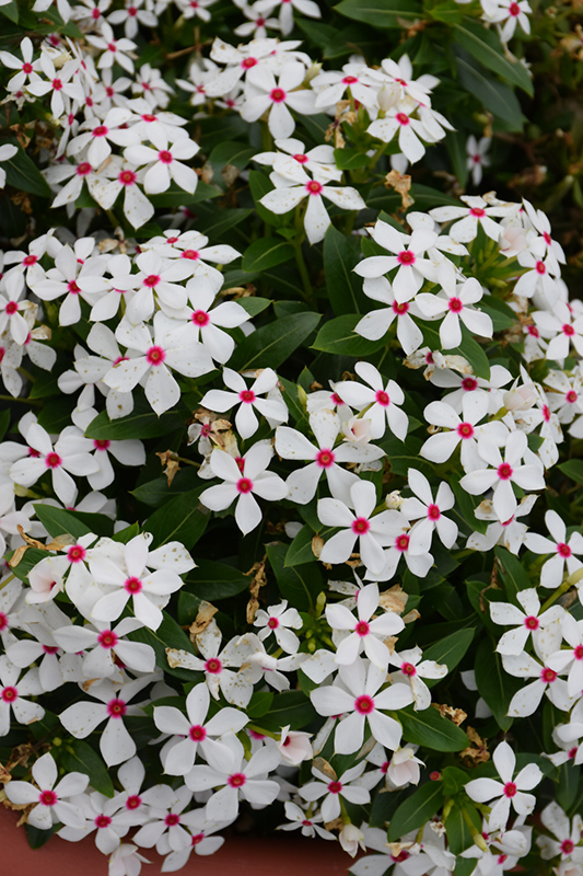 Soiree® Kawaii White Peppermint Vinca features showy white star-shaped flowers with red eyes at the ends of the stems from late spring to mid fall. Its glossy oval leaves remain dark green in colour throughout the year.