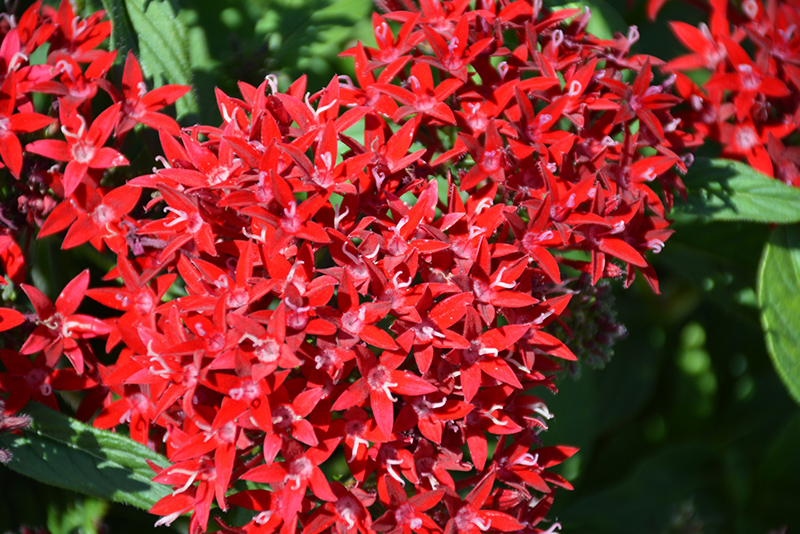 Lucky Star® Dark Red Star Flower features showy corymbs of dark red star-shaped flowers with creamy white eyes at the ends of the stems from late spring to mid fall. Its large textured pointy leaves remain forest green in colour throughout the season.