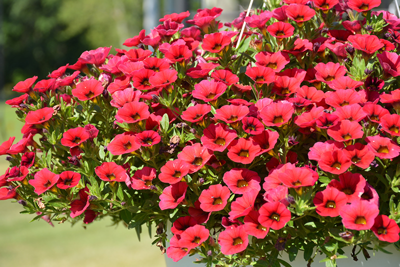 Calitastic® Red Lips Calibrachoa is covered in stunning cherry red trumpet-shaped flowers with yellow throats and a burgundy ring at the ends of the stems from late spring to early fall. Its small pointy leaves remain green in colour throughout the season.