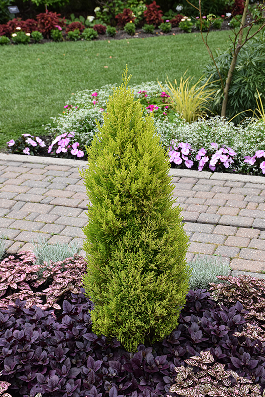 A spectacular slow growing cultivar featuring luminous gold foliage that is yellow at the tips, over underlying gray-green older foliage; broadly columnar in shape with a compact habit; an attractive screen as well as an accent shrub for the landscape