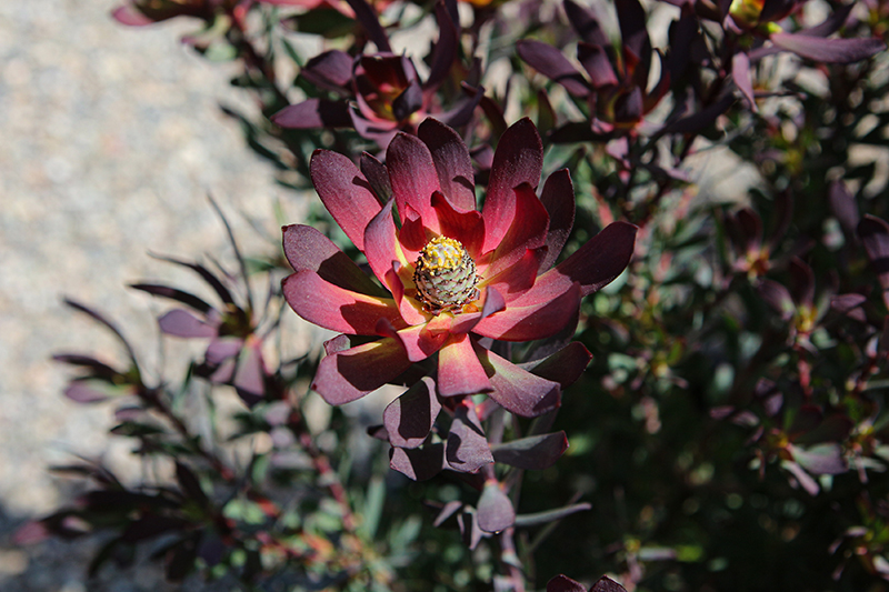 Blush Conebush features showy red flowers with chartreuse eyes and deep purple bracts at the ends of the branches from mid winter to mid spring. The flowers are excellent for cutting. It has attractive grayish green foliage edged in red with hints of chartreuse which emerges red in spring. The narrow leaves are highly ornamental and remain grayish green throughout the winter. The brick red branches add an interesting dimension to the landscape.