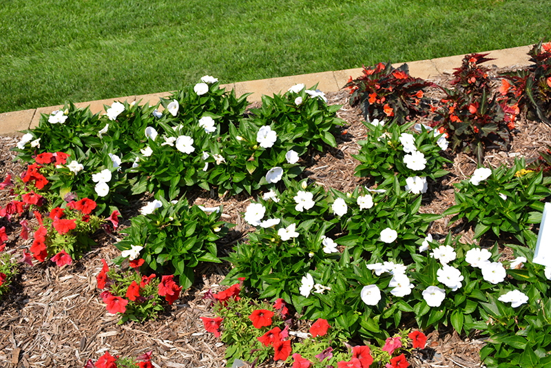 SunStanding® Apollo White Cloud Impatiens will grow to be about 15 inches tall at maturity, with a spread of 24 inches. When grown in masses or used as a bedding plant, individual plants should be spaced approximately 12 inches apart. Its foliage tends to remain dense right to the ground, not requiring facer plants in front. This fast-growing annual will normally live for one full growing season, needing replacement the following year.