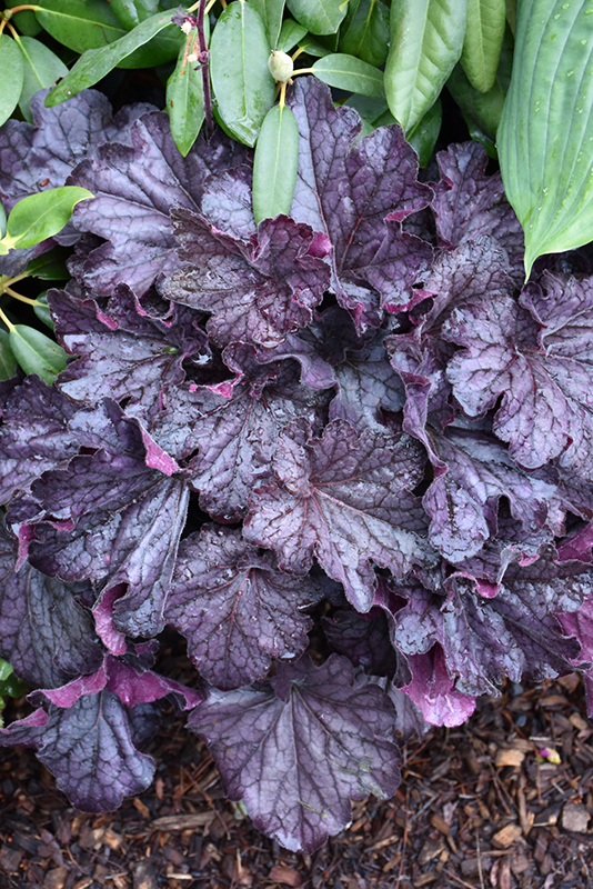 Grande™ Black Coral Bells will grow to be about 18 inches tall at maturity, with a spread of 24 inches. When grown in masses or used as a bedding plant, individual plants should be spaced approximately 20 inches apart. Its foliage tends to remain dense right to the ground, not requiring facer plants in front. It grows at a medium rate, and under ideal conditions can be expected to live for approximately 10 years. As an evegreen perennial, this plant will typically keep its form and foliage year-round.
