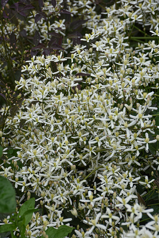 Purple Ground Clematis features airy panicles of lightly-scented white star-shaped flowers at the ends of the stems in early summer. Its attractive compound leaves emerge deep purple in spring, turning dark green in colour with hints of deep purple throughout the season.