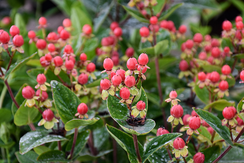 Miracle® Grandeur St. John's Wort has masses of beautiful yellow buttercup flowers at the ends of the branches from late spring to early summer, which are most effective when planted in groupings. The flowers are excellent for cutting. It features an abundance of magnificent cherry red berries from late summer to mid fall. It has dark green deciduous foliage. The pointy leaves do not develop any appreciable fall colour. The brick red stems can be quite attractive.