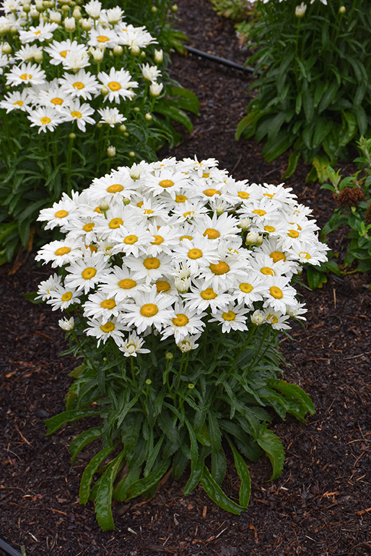 An early to flower, sturdy bloomer featuring large, classic white daisy flowers with golden centers; a beautiful addition to the garden when massed; compact, weather tolerant, and blooms from spring into summer