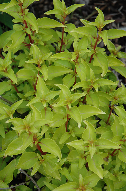 Golden Gate Hardy Fuchsia features dainty nodding deep purple bell-shaped flowers with violet overtones and crimson calyces along the branches from early summer to mid fall. Its attractive pointy leaves remain gold in colour with hints of chartreuse throughout the season. The crimson stems are very colorful and add to the overall interest of the plant.