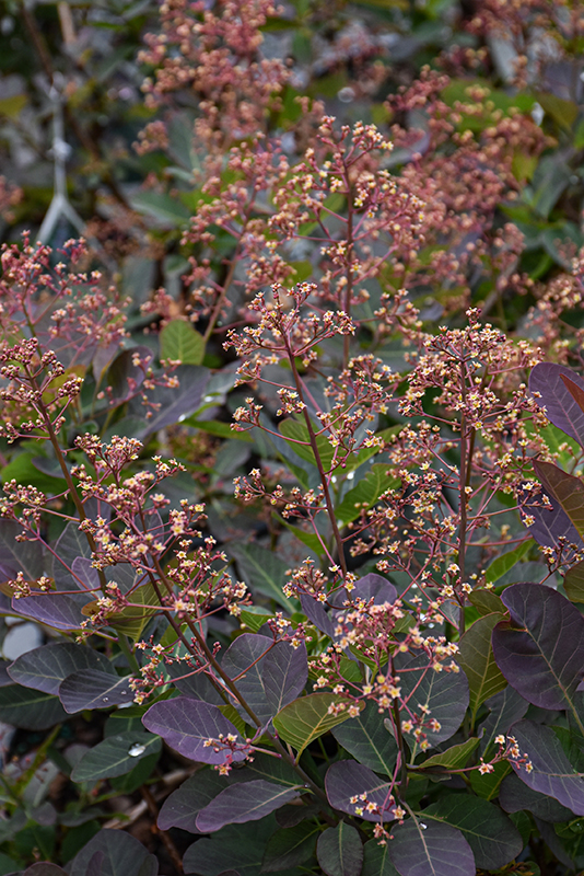 The Velvet Fog® Smokebush features airy panicles of pink flowers with red overtones at the ends of the branches from early to mid summer. It has attractive bluish-green foliage with light green undersides which emerges red in spring. The oval leaves are highly ornamental and turn outstanding shades of burgundy and in the fall.