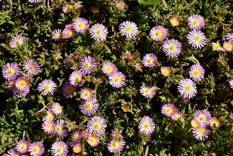 A low growing carpet-like, succulent, native to South Africa but amazingly hardy in North America; dazzling pink, daisy-like flowers with bright yellow centers; perfect for xeriscapes, rock gardens, screes and sandy soils