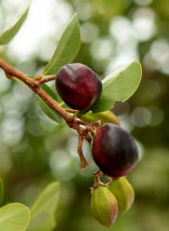 Cocoplum is primarily grown for its highly ornamental fruit. The fruits are showy deep purple drupes which fade to black over time, which are carried in abundance from late spring to late summer. The fruit can be messy if allowed to drop on the lawn or walkways, and may require occasional clean-up. It has attractive dark green foliage with grayish green undersides and tinges of chartreuse which emerges brick red in spring. The glossy oval leaves are highly ornamental and remain dark green throughout the winter. The brown bark and coppery-bronze branches add an interesting dimension to the landscape.