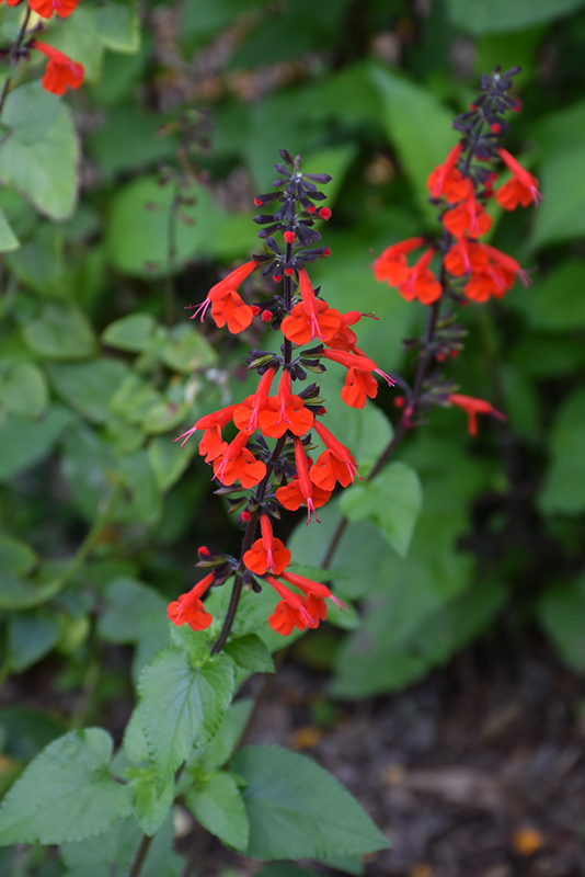 Scarlet Sage has masses of beautiful spikes of scarlet tubular flowers rising above the foliage from early summer to mid fall, which are most effective when planted in groupings. The flowers are excellent for cutting. Its attractive fragrant heart-shaped leaves remain dark green in colour throughout the season. The black stems are very colorful and add to the overall interest of the plant.