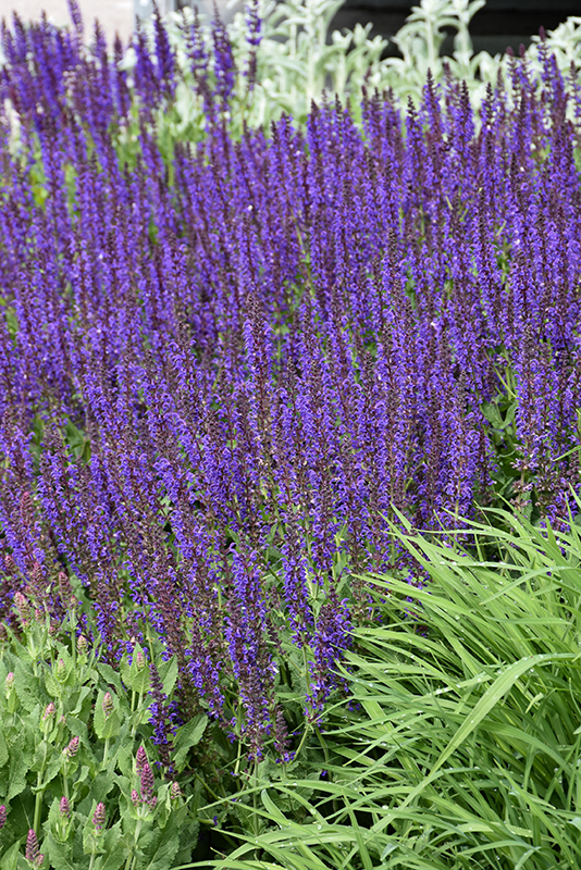 Fashionista® Evening Attire Sage has masses of beautiful racemes of fragrant violet tubular flowers with blue overtones and deep purple calyces rising above the foliage in early summer, which are most effective when planted in groupings. The flowers are excellent for cutting. Its tomentose narrow leaves remain green in colour throughout the year.